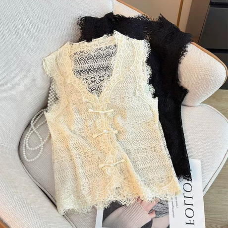 夏季300斤大码新中式盘扣设计感蕾丝马甲胖MM国风钩花镂空背心女
